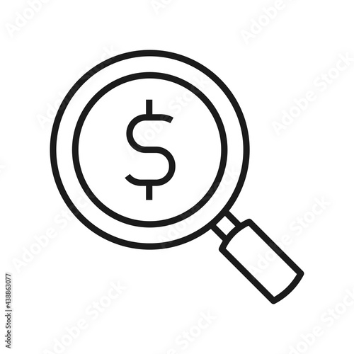 Linear monochrome fundraising icon vector illustration dollar currency logo under magnifying glass