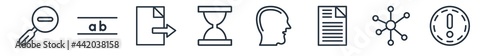 linear set of user interface outline icons. line vector icons such as zoom out, lowercase, export, waiting, head, exclamation button vector illustration.