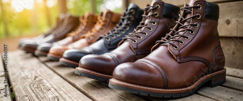 Lineup of polished leather boots on rustic plank floor, outdoor adventure