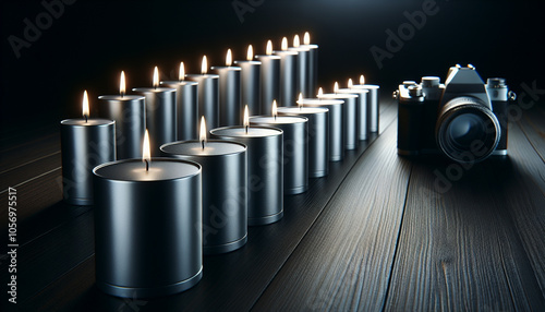 Lineup of Silver Candles on Dark Wooden Surface in Studio Lighting