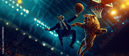 Lion in business suit and Tiger in business suit. They are soaring for a slam dunk, with the arena lights creating a dramatic effect