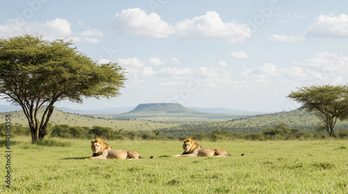 Lions Relaxing in Grassy Area with Shade and Open Space