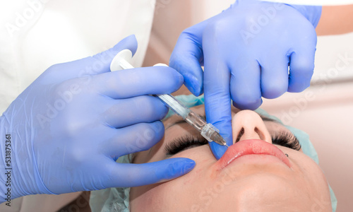 Lip augmentation. Beautician injects hyaluronic acid into the lips of a girl with a syringe. The cosmetologist doctor performs the procedure in the cosmetology office. Plastic surgery.