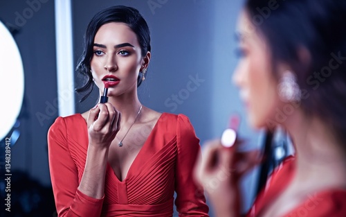 lipstick, Woman applying lipstick in front of mirror, studio