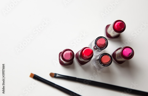 lipsticks and make-up brushes on white