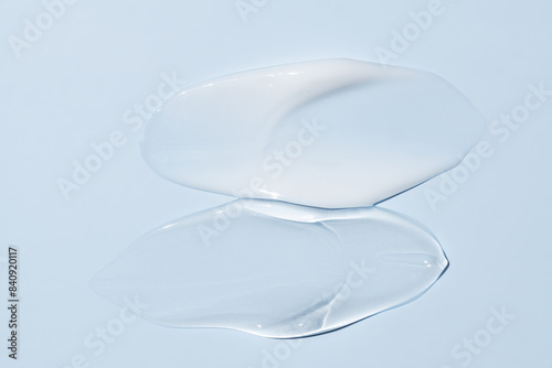 Liquid cream and gel cosmetic smudge drops texture on blue background. cosmetic smears cream texture