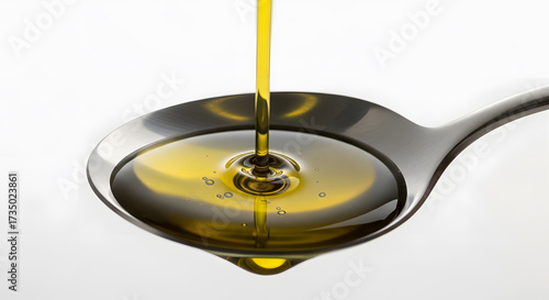 Liquid Gold: An up-close shot of a spoon overflowing with a stream of golden olive oil, embodying health, purity, and the essence of a culinary delight.