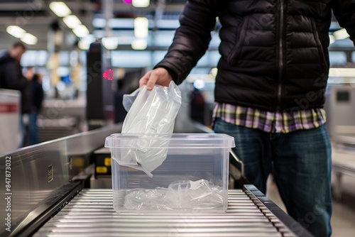 Liquids at Airport Security Check: Passenger Holding Plastic Bag Above Laptop and Personal Items on Conveyor Belt