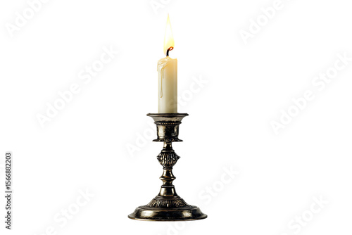 Lit candle in antique candlestick holder on black background