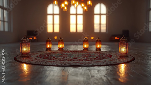 Lit lanterns on rug in arched window room at sunset
