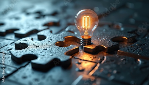 Lit lightbulb sits on incomplete puzzle. Idea emerges from problem solving. Pieces connect forming concept. Brainstorming solutions. Discovery. Innovation.
