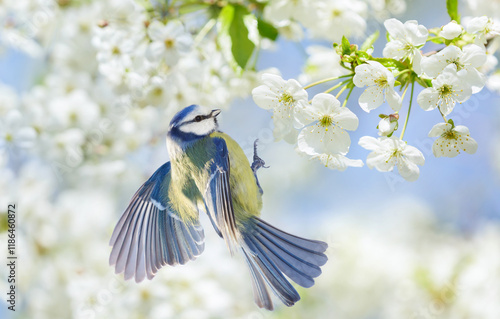 Little bird flies over blossom cherry tree with white flowers. Blue tit, Parus caeruleus