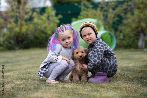 little boy and girl hugging a dog