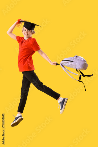 Little boy in graduation hat with backpack jumping on yellow background. End of school year