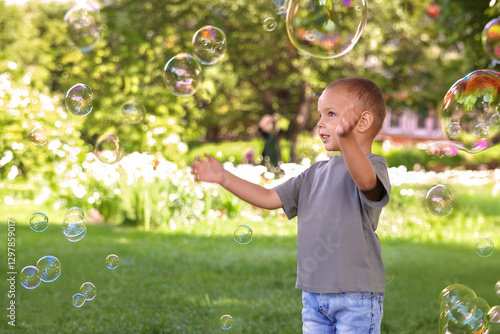 Little boy playing with soap bubbles in nature in summer