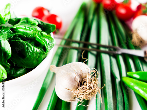 Little branch of cherry tomatoes, bowl of spinach, green hot peppers,onion leaves, garlic and fork over white isolated background.
