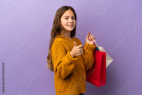 Little caucasian girl isolated on purple background holding shopping bags and with thumb up