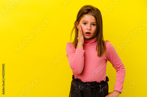 Little caucasian girl isolated on yellow background shouts loud, keeps eyes opened and hands tense.