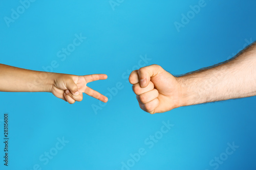 Little child and his father playing rock, paper and scissors on blue background, closeup