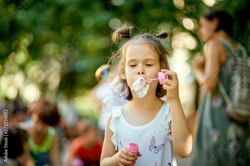 Little cute baby girl is making soap bubbles in the park on summer day
