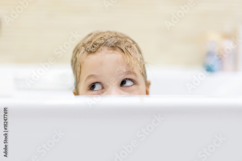 Little cute caucasian girl with blond wet hair having fun and peaking out of bath side with tricky sight