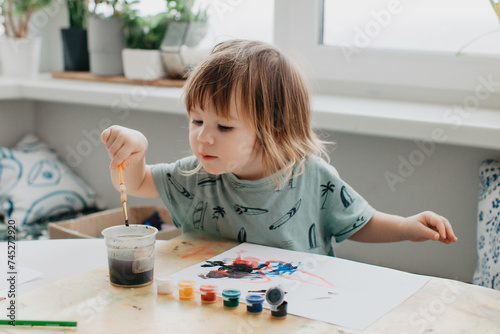 Little girl draws with paints at the kitchen