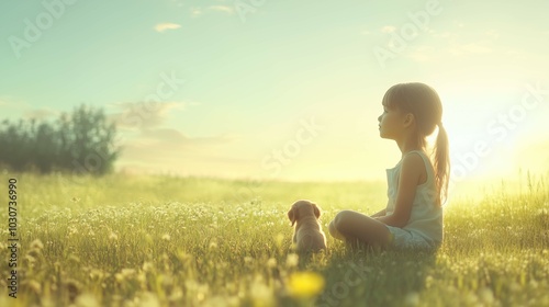 Little girl is sitting in a peaceful, open field with a small puppy nearby, surrounded by soft, calm scenery. The background features a clear sky and gentle greenery