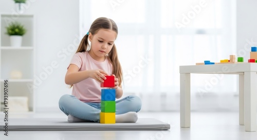 Little girl playing with colorful building blocks while sitting on floor. Child development and early childhood education concept for kids.