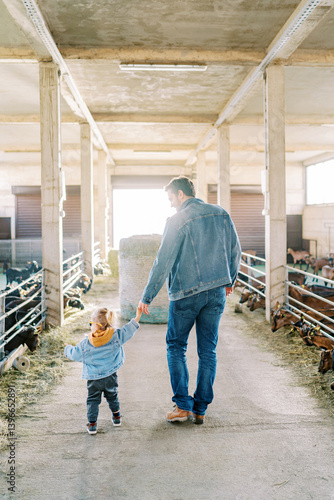 Little girl walks with her dad by the hand and points her finger at the goats in the pens. Back view
