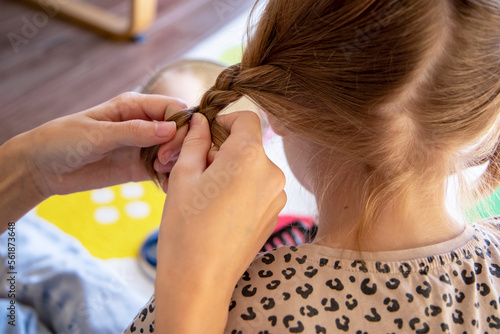 Little girls braid their hair, make a braid for their sister. Braided hairstyles, hair care. Friendship and care