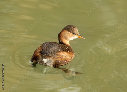 Little grebe in winter plumage floats in the water.