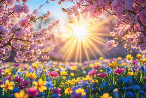 Lively Spring Scene with Colorful Flowers and Bright Sunshine