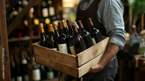 Loader carries box with bottles to store, shop storage or bar. Delivery alcoholic drinks. Vector cartoon illustration with man holding wooden crate with wine and glass bottles on stand