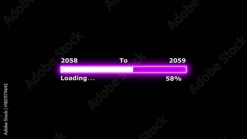 Loading 100 percent complete progress bar digital interface technology modern design white color 4k illustration. New year 2058 to 2059 loading bar. Neon bright rectangle frame black background.