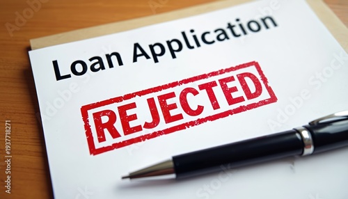 Loan application form with a big red REJECTED stamp. Pen rests on paper. Represents financial denial, setback, or failure. Document shows a negative decision.