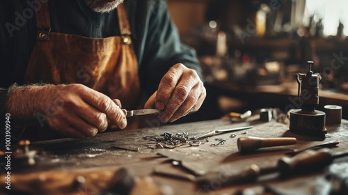Local craftsman making metal crafts, bright workshop, clean background, minimal elements, copy space