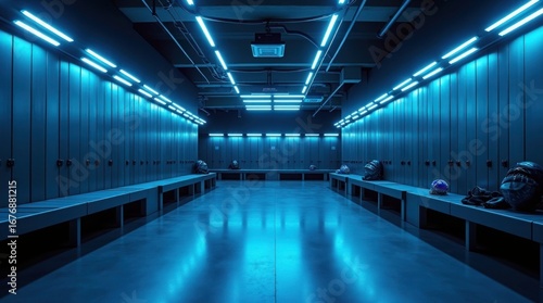 Locker room with blue lighting sports benches