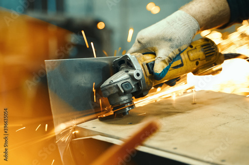Locksmith in special clothes and goggles works in production. Metal processing with angle grinder. Sparks in metalworking