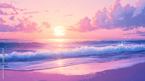 Lofi anime aesthetic captures a peaceful sunset at a tranquil beach with soft ocean waves