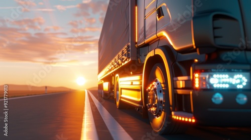 Logistic fleet transporting supply goods at dawn, with copy space, covering all objects, deep depth of field.