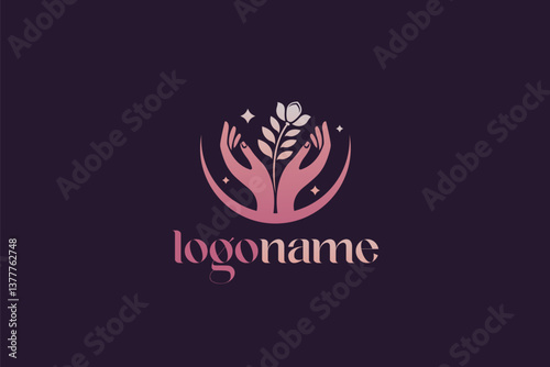 Logo design of two feminine hands with a flower in the middle, symbolizing beauty, care, harmony, and femininity, often with elegant lines and soft, delicate elements.