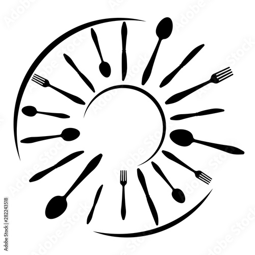 Logo of a cafe or restaurant made of forks, spoons and knives. Round shape with place for text.