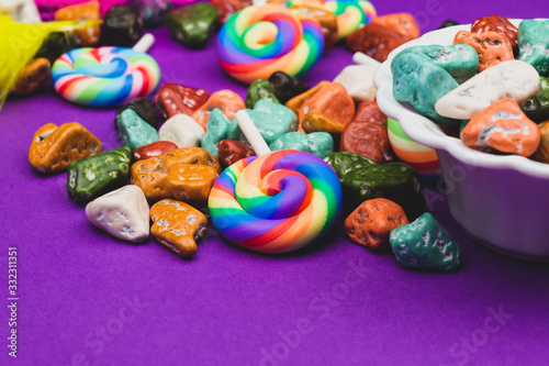 Lollipops and candy pebbles. sweets in the form of colored stones. colored background with colorful candies