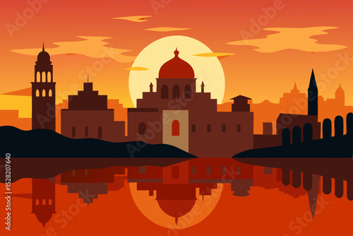 London city architecture skyline silhouette at sunset vector illustration
