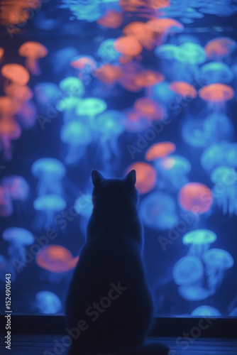 Lone Cat Observing Glowing Jellyfish Aquarium In Nighttime Serenity