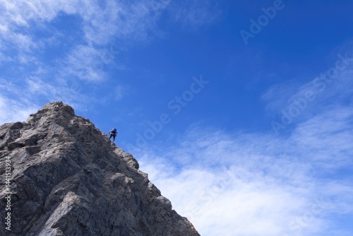 lone climber ascends steep rugged mountain face against clear blue sky