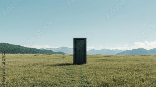 Lone door in vast grassy field under clear sky, mountains in background.
