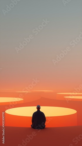 Lone Figure Contemplating Abstract Sunset Horizon: Minimal Future