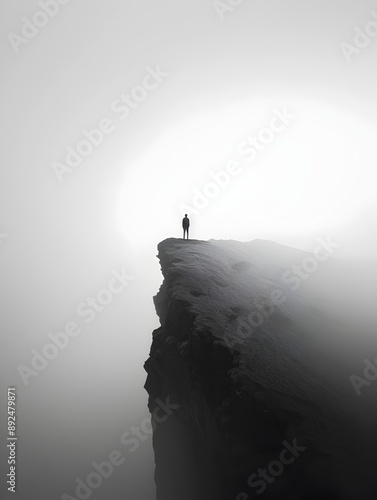 Lone figure stands atop a misty mountain cliff,exploring the boundless expanse of nature's grandeur