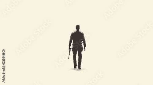 Lone figure walking away, carrying a rifle.
